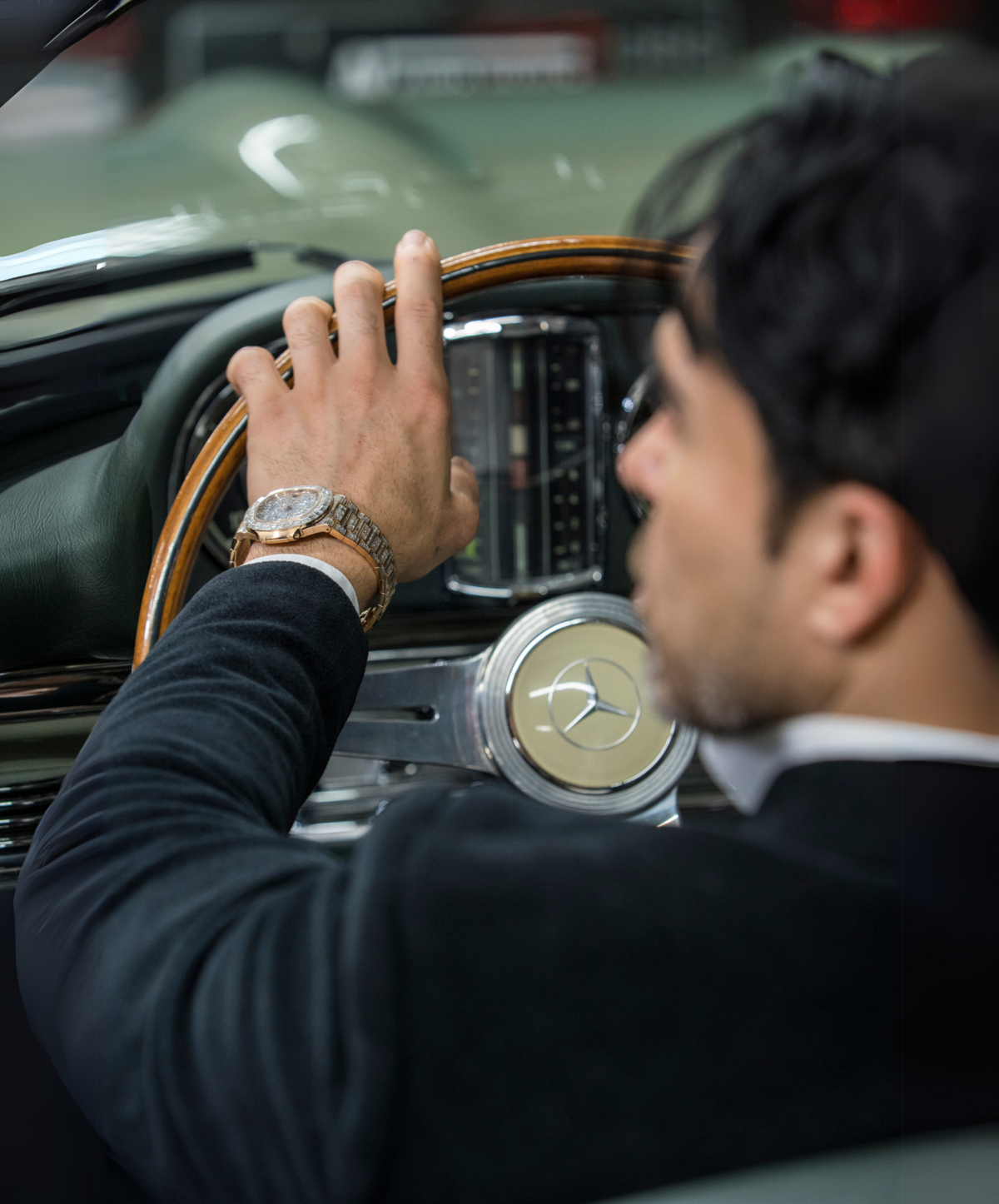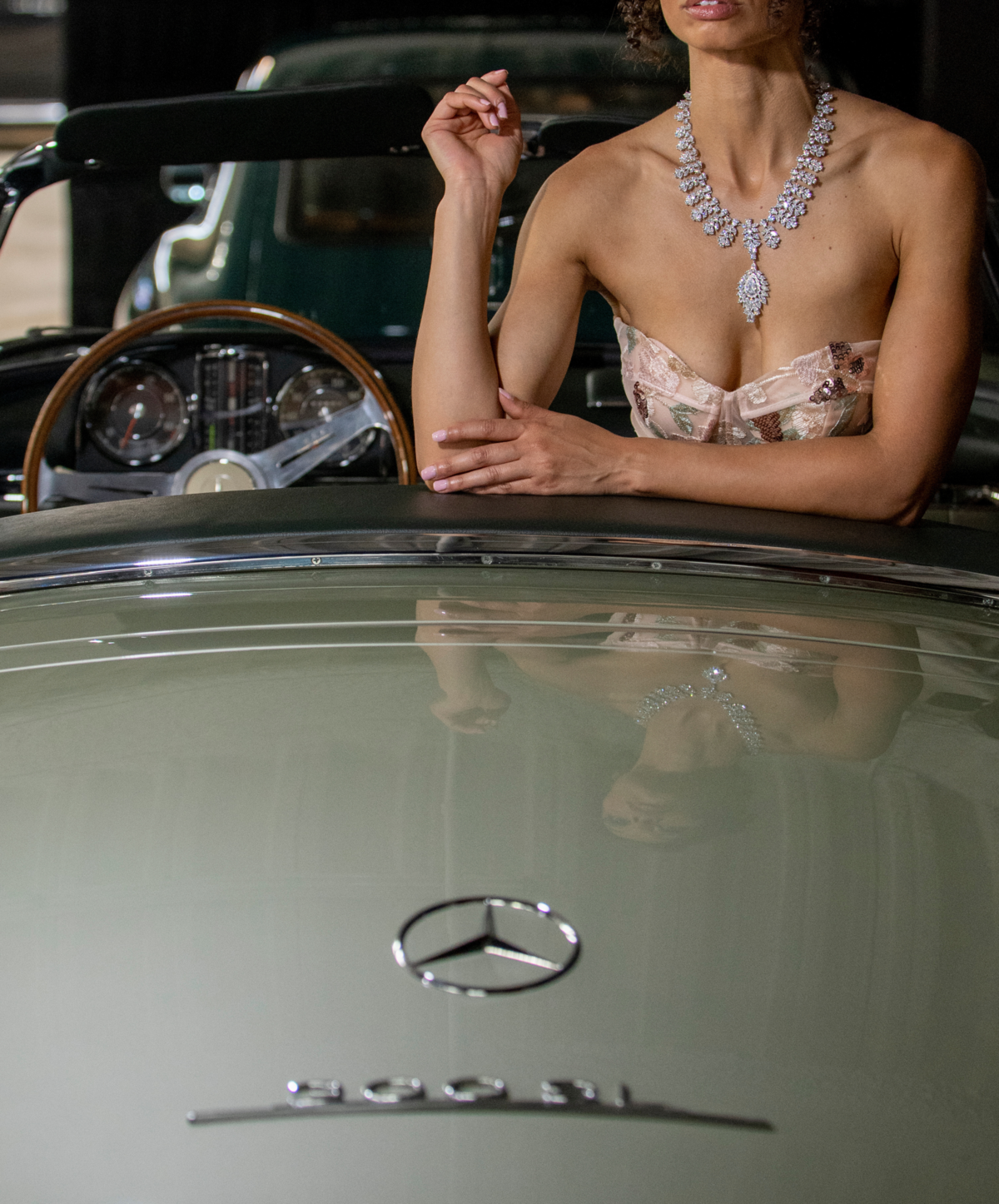 ‘Timeless Elegance’ captures the essence of refined luxury and sophistication, inspired by meticulous craftsmanship embodied in the iconic design of the Mercedes-Benz 300SL coupled with the enduring allure of exclusive bespoke jewelry- 90+ Carat DEF flawless to VVS2 Diamond necklace crafted by Peter Marco. This series is an expression of those who appreciate time-honored beauty, excellence of design, and exceptional quality.